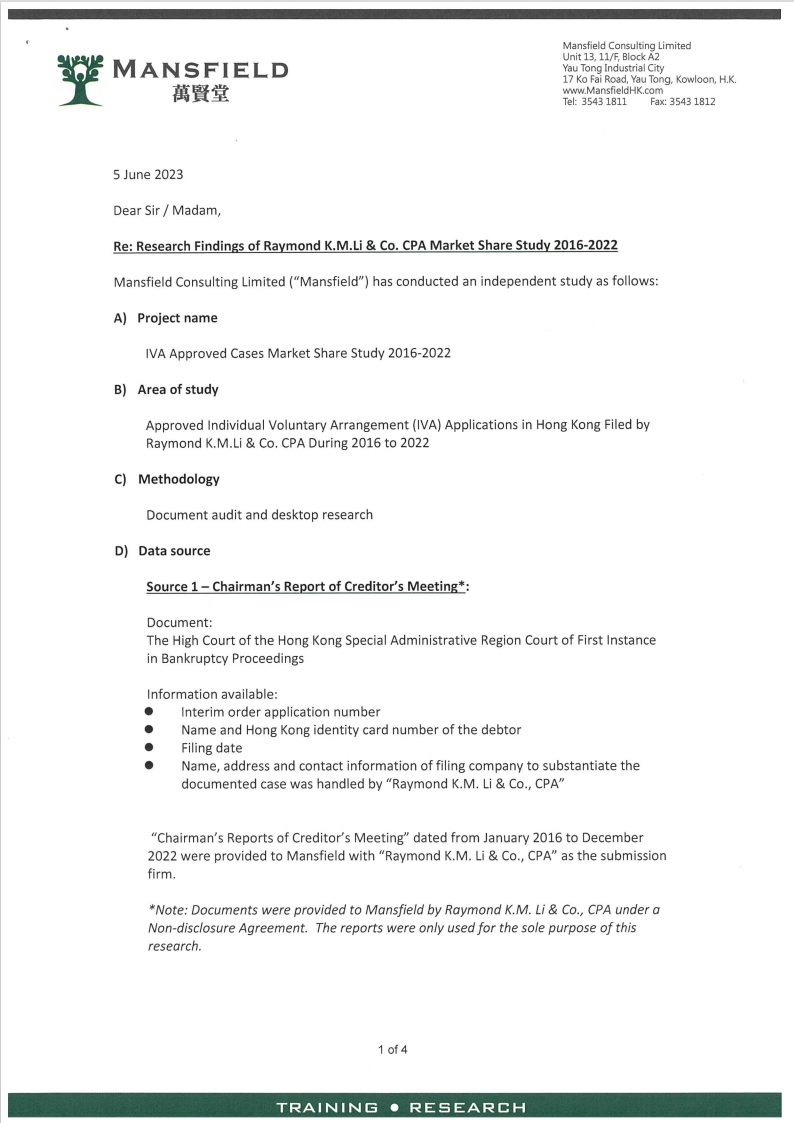李建民執業會計師事務所專注於債務重組服務十多年,成功為全港數千人解決債務問題,幫助數千家庭重過新生活。我們的專業、專注和誠信取得客戶及業界一致的高度認可,本所一向秉持中肯、以客為中心、收費公道和透明的原則,贏得客戶的信任和口碑。憑藉實力和佳績,本所於2024年6月24日榮獲專業獨立第三方市場調查公司 "Mansfield Consulting Ltd"核實和認證本所於2016至2023年期間,每年處理全港超過一半(>50%)以上的債務重組成功批核個案。債務重組市場佔有率連續8年全港第一*,成為全港最多人選用之債務重組事務所*。